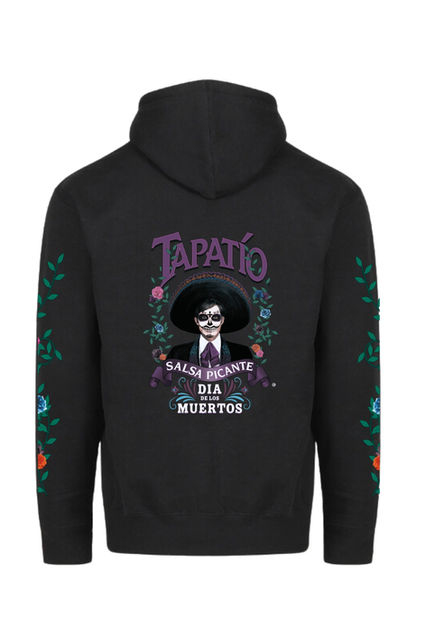 Spice up your style with the exclusive Tapatio Día de los Muertos 2024 Hoodie featuring the iconic charro in a festive sugar skull design. The charro’s intricate face is framed by vibrant flowers, perfect for Día de los Muertos. This premium Hoodie boasts a bold full logo on the back and a smaller design on the pocket. This is paired with beautiful vines of flowers flowing down the sleeves; Culminating in what is sure to be your new favorite hoodie in your closet. Made from 60/40 premium cotton/polyester fleece, it offers comfort and is great for casual wear or special events.